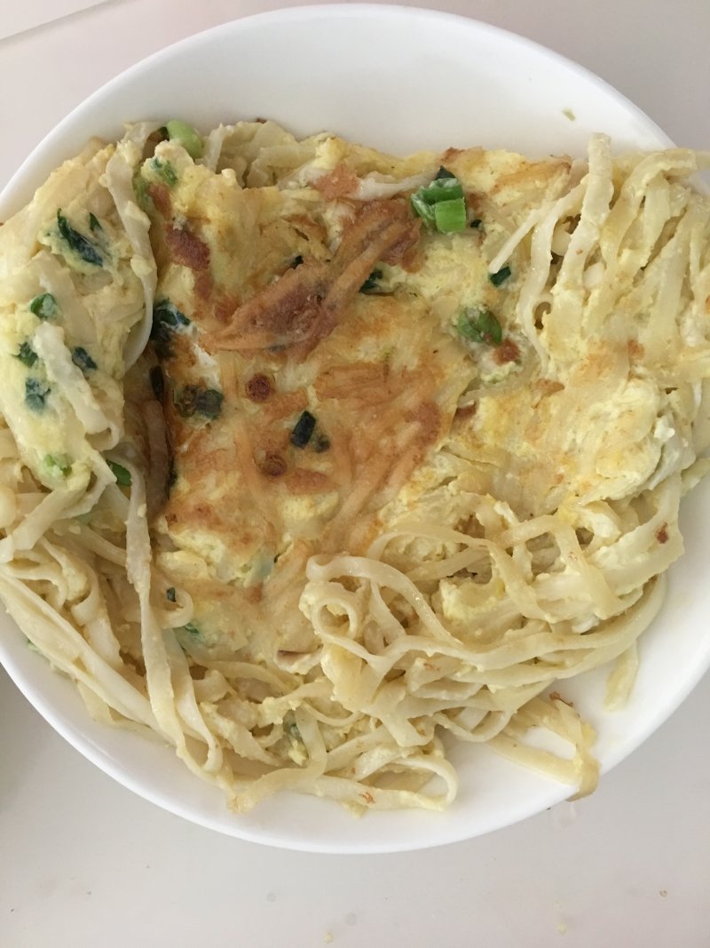 5:锅烧热加油,油热后加入面条鱼鸡蛋液。
