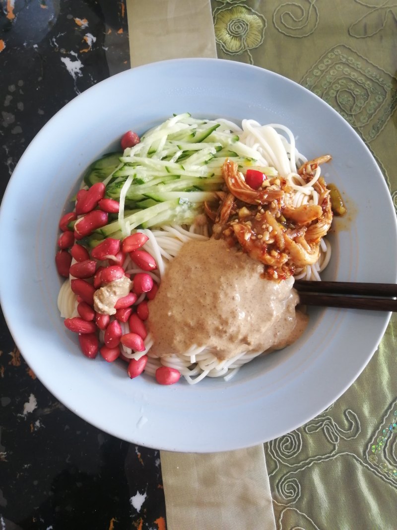 8:淋上芝麻酱,料汁,加入花生和黄瓜丝。