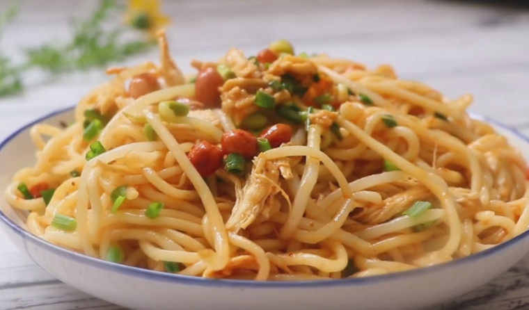 干面条一把;黄瓜半根;花生一把;鸡肉丝少许;