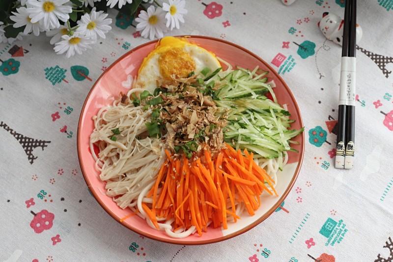 7:接着把准备好的胡萝卜丝、黄瓜丝、金针菇、葱花摆在面条表面,再撒上少许白芝麻。