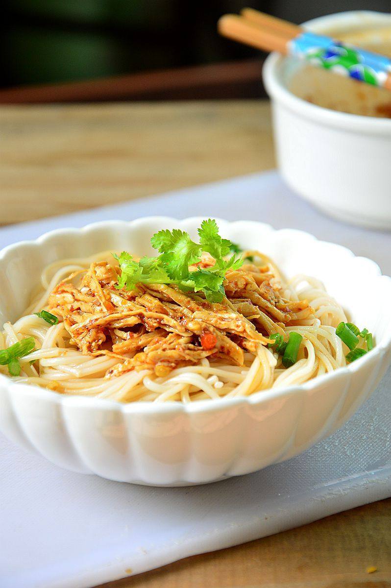 7:捞起面条,把凉拌好的鸡丝倒入面条里加入葱和香菜,一起拌均匀即可开吃.