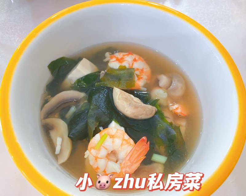 口蘑适量;嫩豆腐1盒;裙带菜适量;虾仁适量;