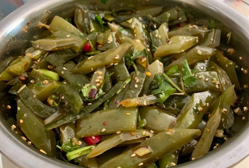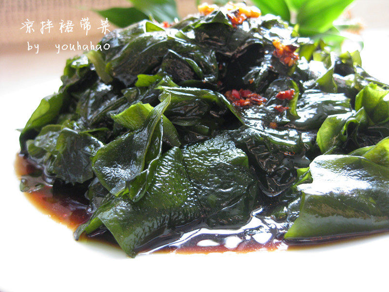 半干裙带菜泡发时间很短,焯水的时间也很短,一定不要长时间焯水,否则会变得非常黏糊,油辣子根据个人的口感是的添加。
