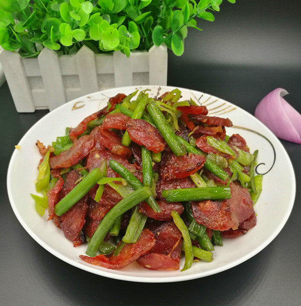 3:锅中倒入植物油,开大火烧热,放入腊肉煸炒几下后倒入蒜苔,加盐、胡椒粉和牛肉粉,炒至蒜苔微软。