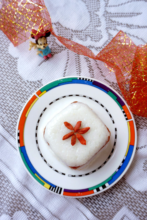 1:用料:糯米150克,山楂糕200克,白砂糖30克,枸杞少许