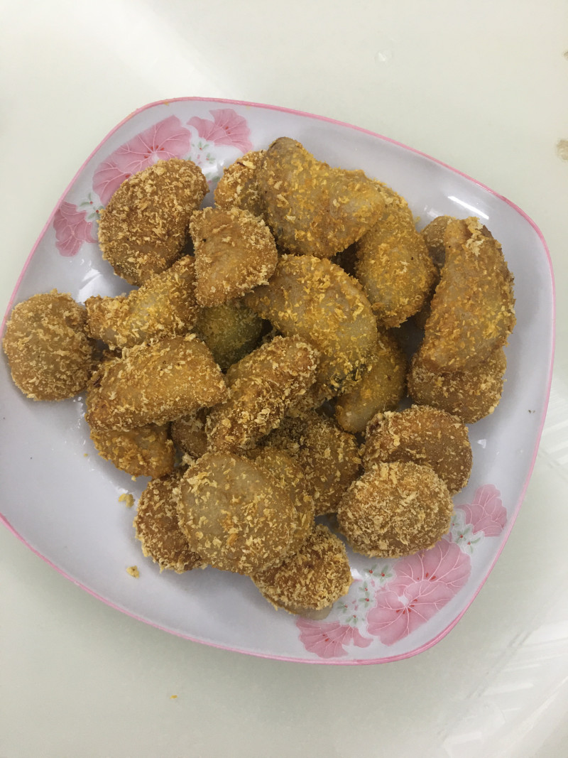 3:分成小剂子,擀扁,沾少许水,再沾上面包糠。