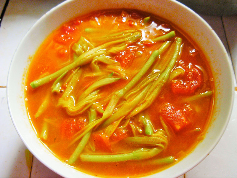 6:番茄酱加水烧开后,加入黄花菜,煮到黄花菜变软就可以出锅了