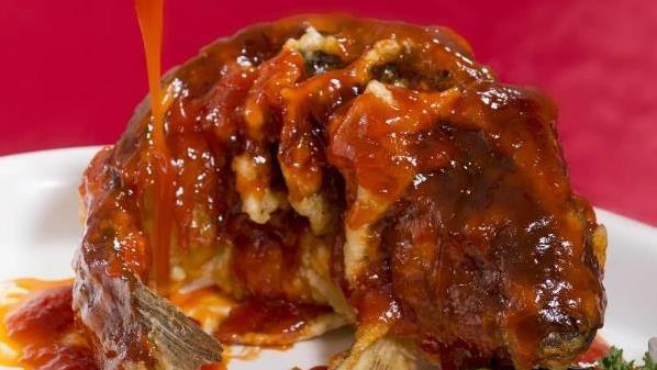 鱼泡好后,捞出来擦干水分。别偷懒,水分不擦干,炸出来就不脆了。鱼身上拍点干面粉,每个刀口都塞满淀粉,这样炸的时候鱼肉受热均匀,外皮才酥。锅里倒油,烧到六成热,拎着鱼尾慢慢放进去。别急着翻,轻轻淋点热油在鱼身上,两边定型后再炸。火候得控制好,中火慢炸,鱼皮金黄、鱼肉嫩滑才算成功。
