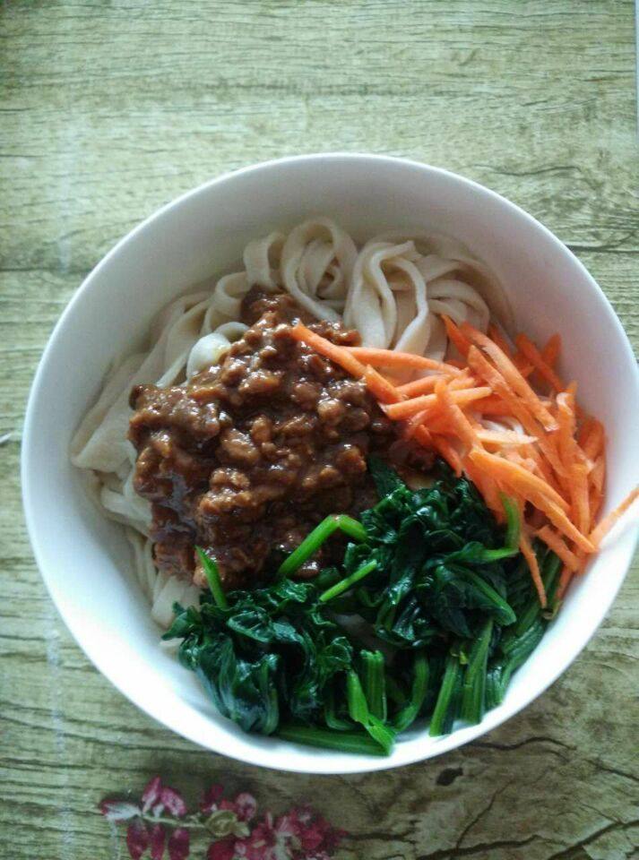 8:放上肉酱,蔬菜,可以吃了。喜欢吃什么蔬菜都可以放。