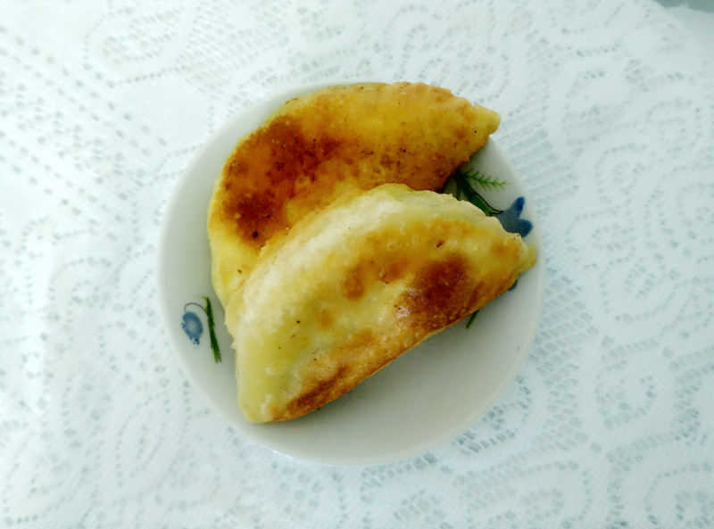12:锅烧热时加入油,把韭菜盒子的正面朝下放入锅里烙,盖好盖子,翻两个个,见两面金黄鼓起就好了。
