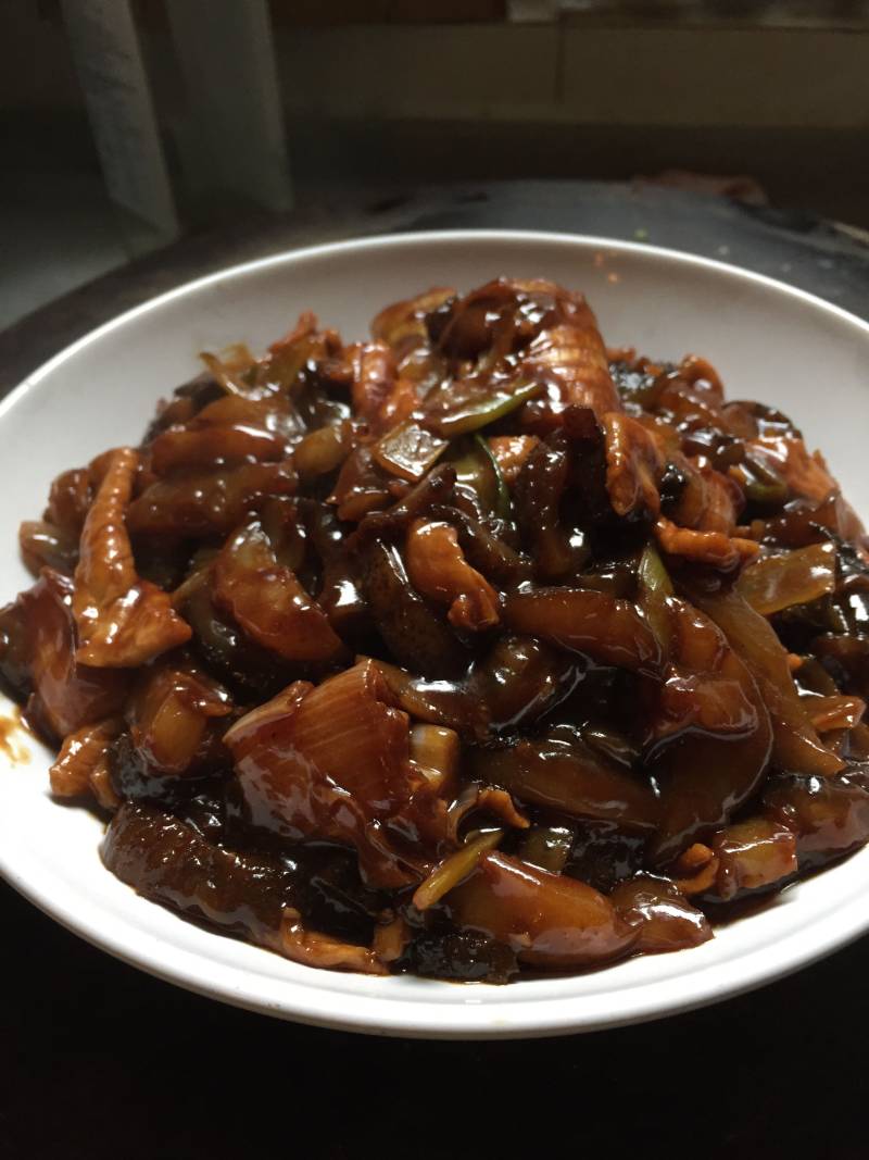 6:转大火,少量多次加入水淀粉(大约1大勺)勾芡,转中火烧透收汁;淋入葱油,关火。