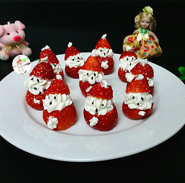 5:将大瓣的草莓放在盘中,然后挤上适量打发好的淡奶油,做圣诞老人的头部。