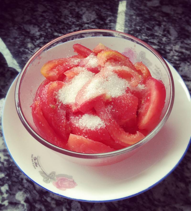 6:切成小块后放在碗里可以放入冰箱里放一小时冰过后的西红柿拿出来撒上白糖冰冰凉凉的很好吃