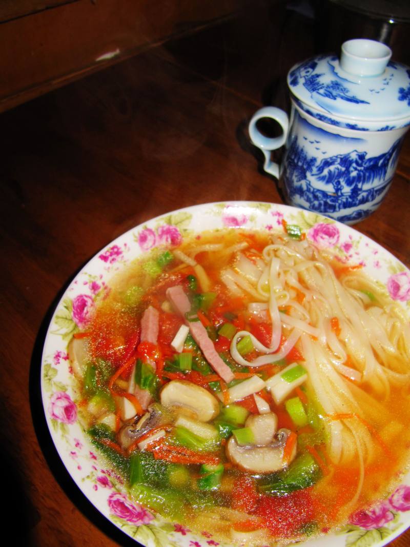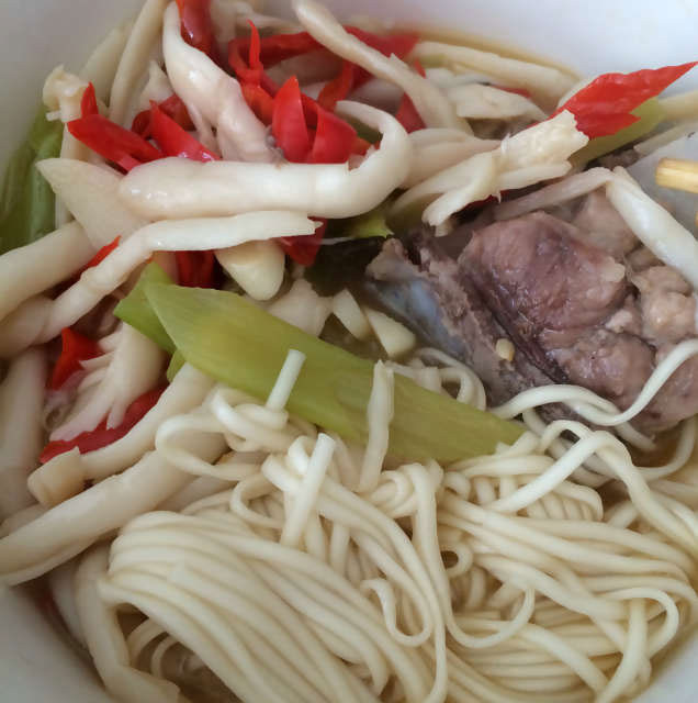 1:面条煮熟过冷水待用,高汤一小碗,鲜蘑菇少许。