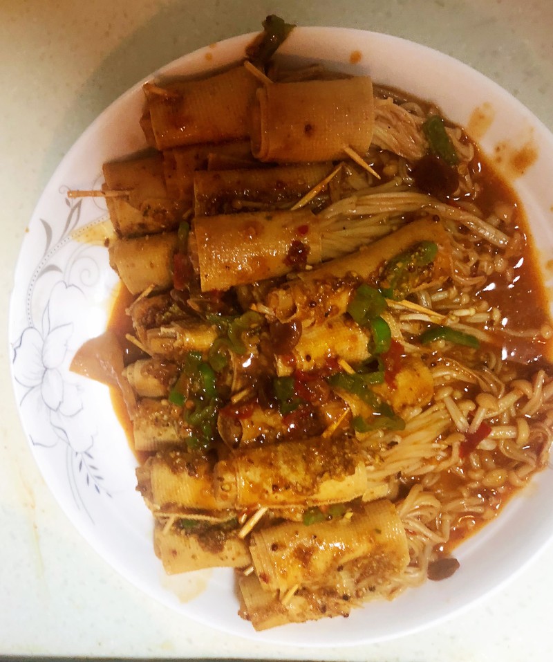 4:加入适量的清水,再放入豆皮和金针菇,倒入老抽,盐后盖上锅盖煮5分钟。