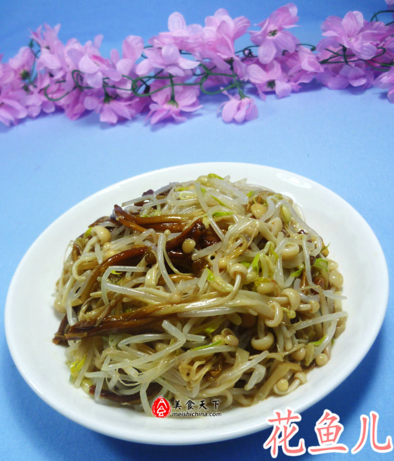 7:不停翻动,尽量让金针菇粘上酱料入味。我这太多了,搅拌不开了。
