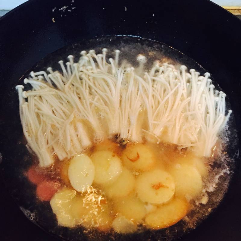 5:倒水煮,水开后放盐调味放入金针菇和煎好的豆腐