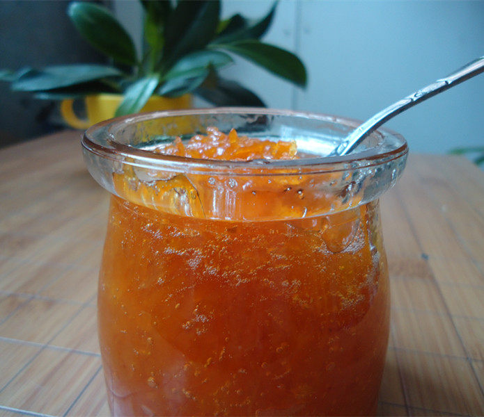 5:这一步骤又忘记拍照,抱歉额,水煮柚子皮15分钟,水黄黄的倒掉,用网状漏勺冲洗柚子皮数次。烧一碗水的量,入柚子皮柚子果肉,冰糖依个人口味放多少,中火煮,到了后面水不多,小火慢熬,粘稠,没水了,关火,晾凉