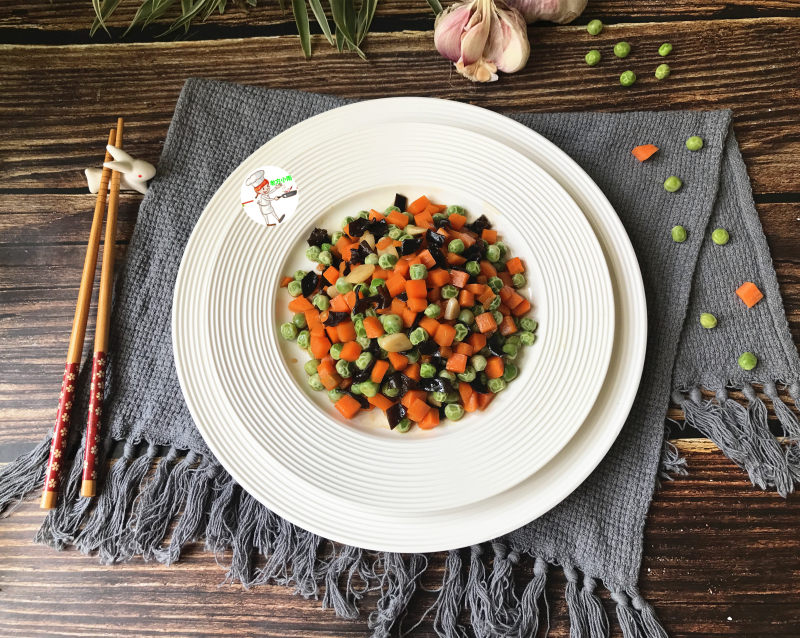 7:放入豌豆、木耳和胡萝卜,翻炒均匀。
