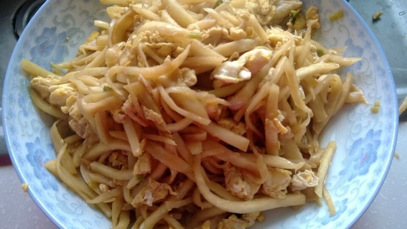 7:待茭白丝变软后,加入之前炒好的鸡蛋;