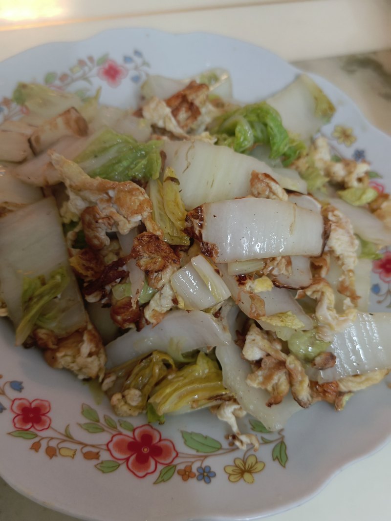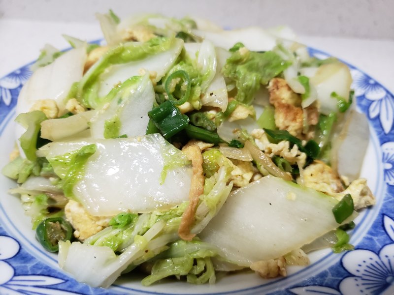 4:锅烧热放少许油,倒入葱和辣椒爆香,再倒入白菜加盐翻炒片刻,继续倒入炒好的鸡蛋,翻炒一下即可。