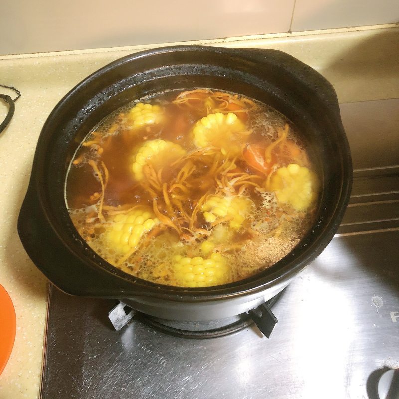 5:10分钟后放入虫草花,玉米,胡萝卜继续炖20分钟。。