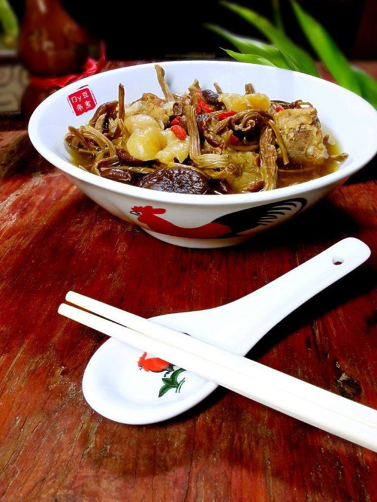 18:排骨炖制八成熟时,加入煎好的蘑菇、熟鹌鹑、枸杞