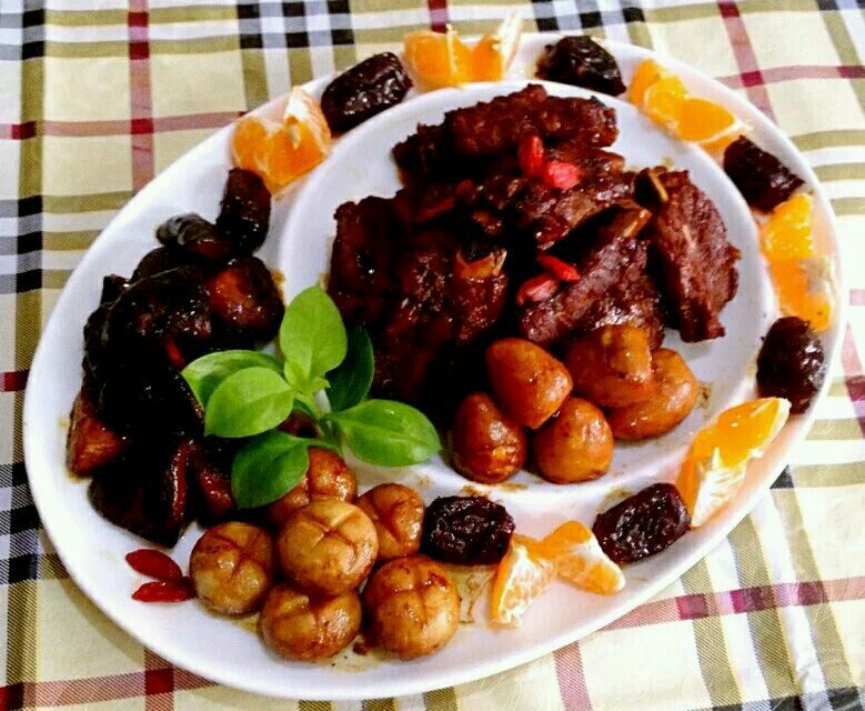 鲜草菇3个;鹌鹑蛋6个;小红枣8个;枸杞适量;鲜口蘑6个;蚝油适量;老抽适量;冰糖适量;大料适量;香叶适量;葱适量;姜适量;干辣椒适量;盐适量;料酒适量;