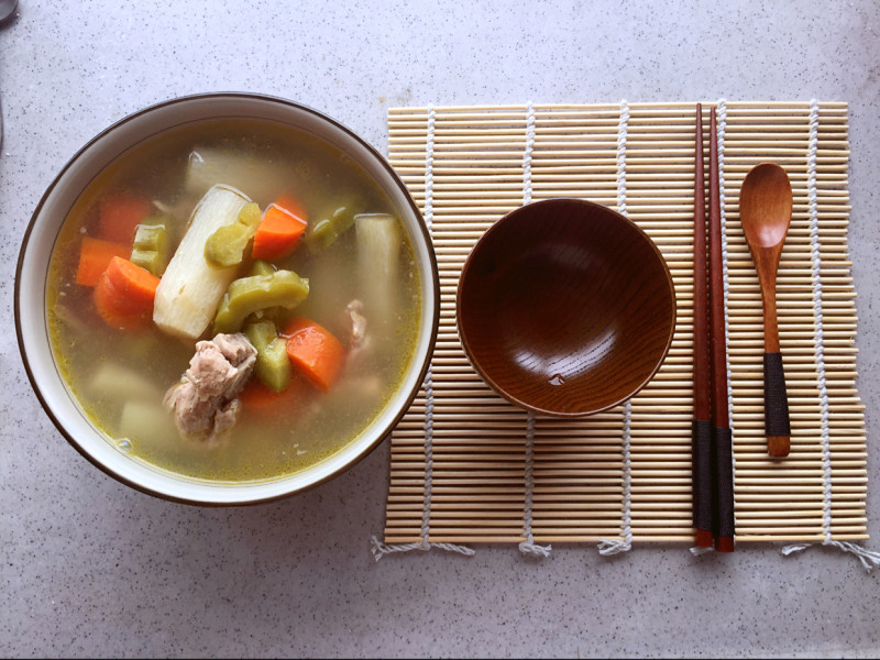 3:排骨煮开后撇掉浮沫,盖上锅盖小火焖煮半小时后加入胡萝卜和山药,再过半小时加入苦瓜,最后再炖20到30分钟,盐调味,撒上葱花即可。