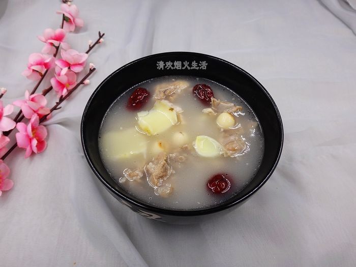 5:排骨汤快煲好时,提前半小时放入莲子、百合、大枣同煲。泡发的莲子和新鲜百合都容易煮熟,煮半小时就差不多了。