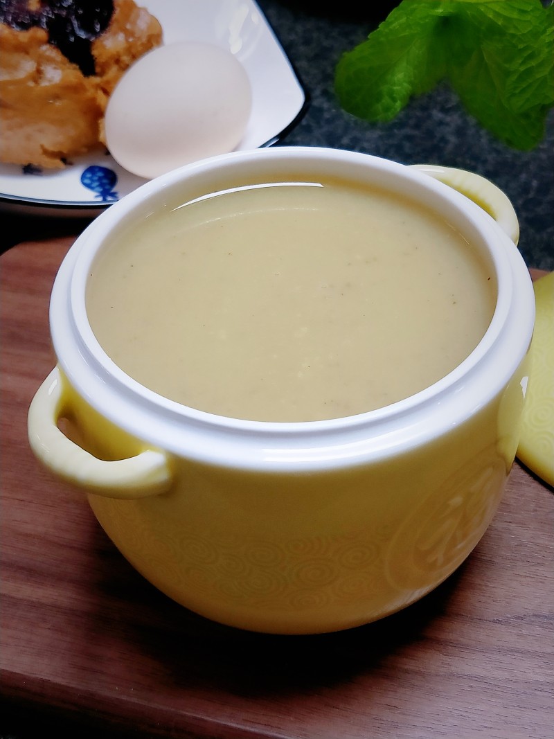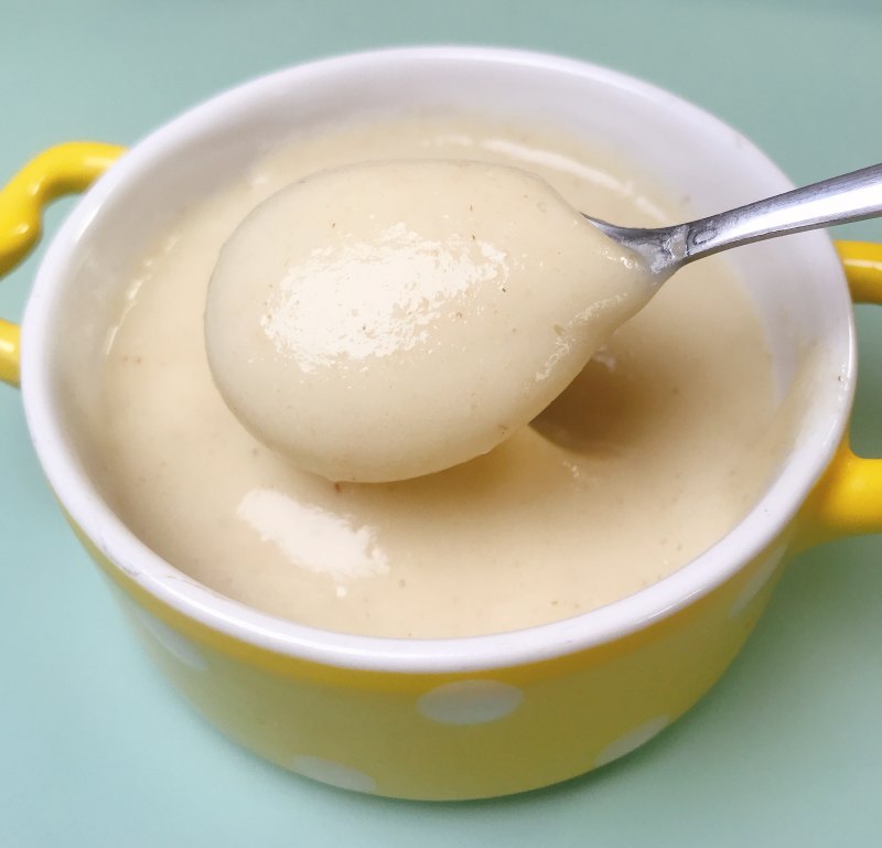 4:搅打成很细腻的苹果糊,煮好就搅打,搅打后的温度刚刚好适合调米糊
