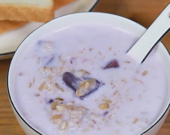 3:紫薯软烂后加入牛奶煮沸即可。