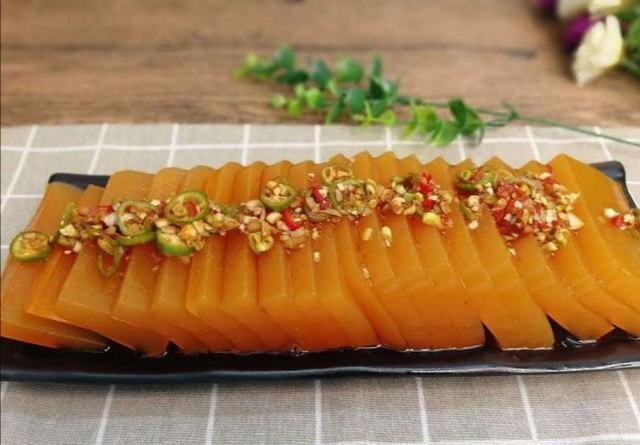 5:时间到了,凉粉已经冷藏好了,倒在案板上用刀切成小块,摆放在盘子中。