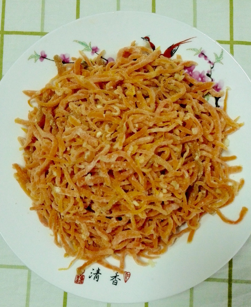 2:拌匀后静置半小时,待胡萝卜丝变软,出水。
