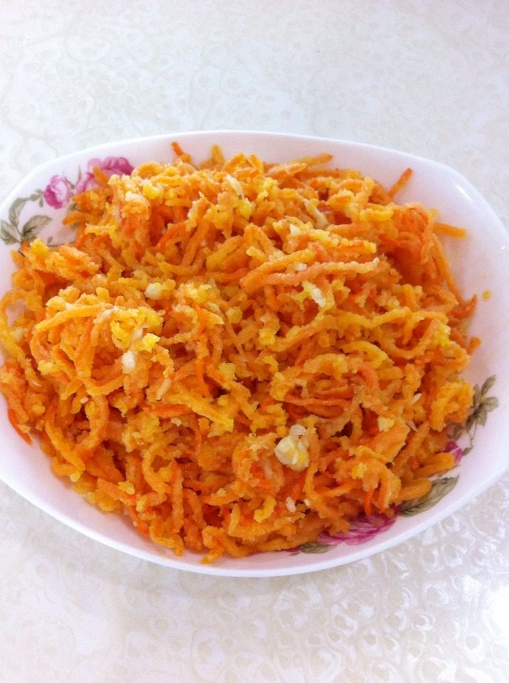 1:胡萝卜去皮切成火柴杆粗细的丝。