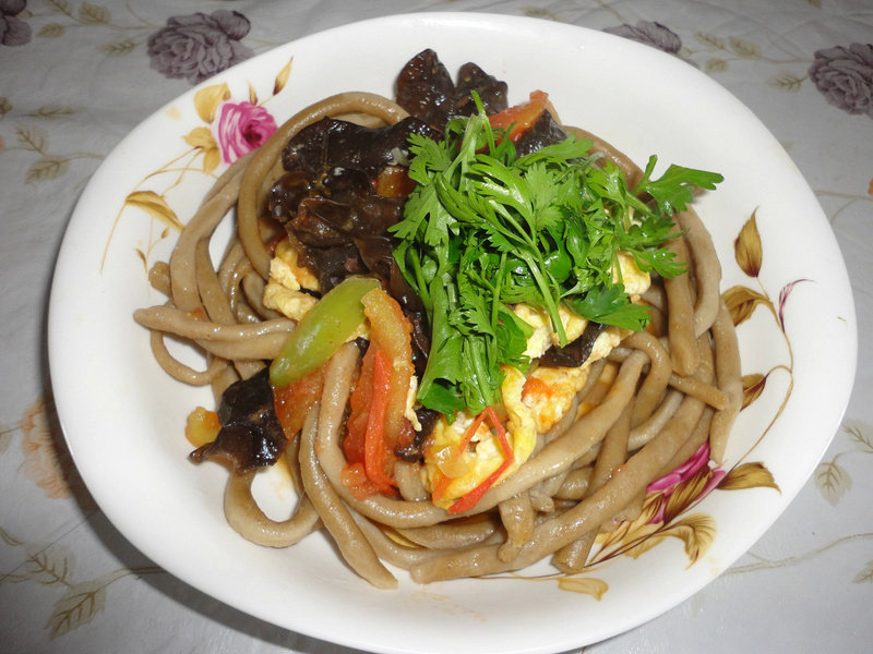 5:鸡蛋在油锅里炒熟,下西红柿、木耳、尖椒再煸炒一会加盐,加少许水,炖一会加鸡精出锅,淋上香菜就是卤汤了。蒸好的莜面揭开锅盖稍微凉一下,用手撕开,浇上卤汤就可以吃啦,很香很有嚼头。