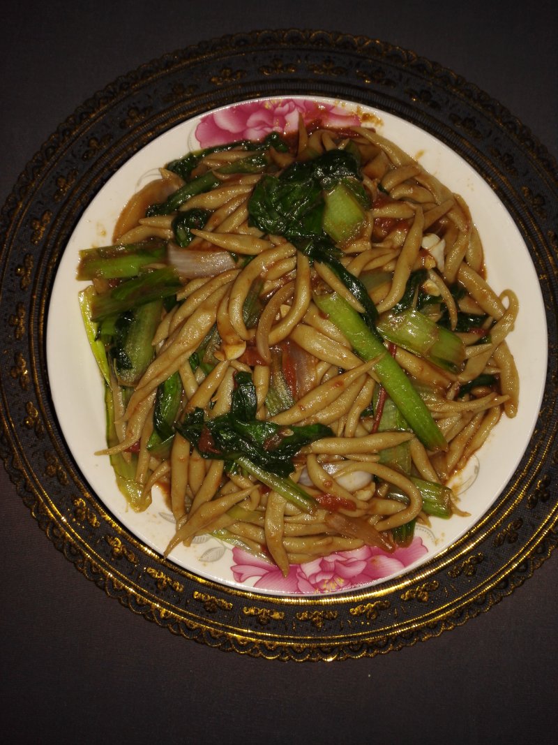 7:小白菜炒至快熟的时候,放入盐、酱油调味,把蒸好的莜面鱼鱼倒进锅里和菜一起翻炒