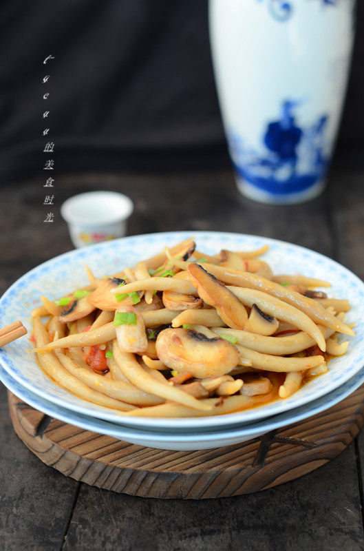 9:接着再加入蒸好的莜面鱼鱼一起翻炒,大火收汁。