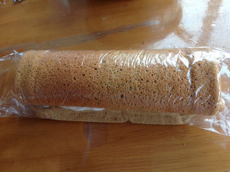 9:淡奶油加入白砂糖,打至不流动。将蛋糕倒回面朝上,抹上淡奶油,用擀面杖反方向卷着底下的油纸,上面的蛋糕正方向卷起来,用保鲜袋装好,入冰箱过夜定型。