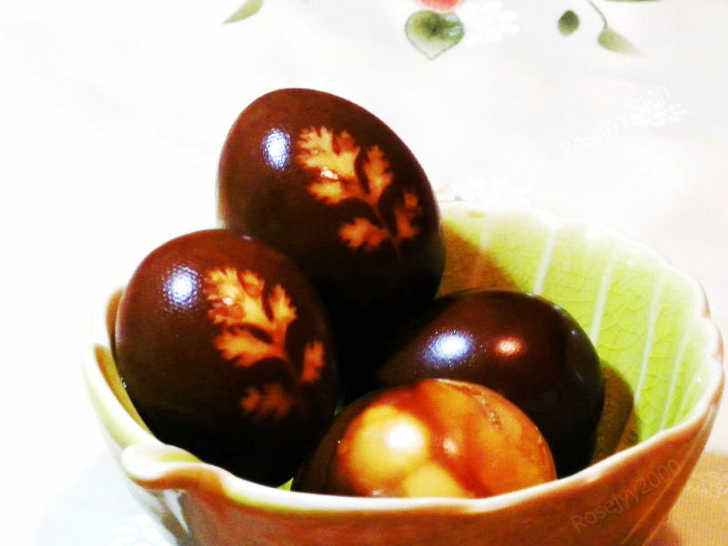 5:等煮到蛋已经上色,捞起,解开绳子,轻轻刮去香菜叶,带花的蛋就做成了,将没有剥壳的蛋,剥去壳,壁裂纹的蛋也做成了,不过就味道没有剥壳后放入汁里煮的浓。