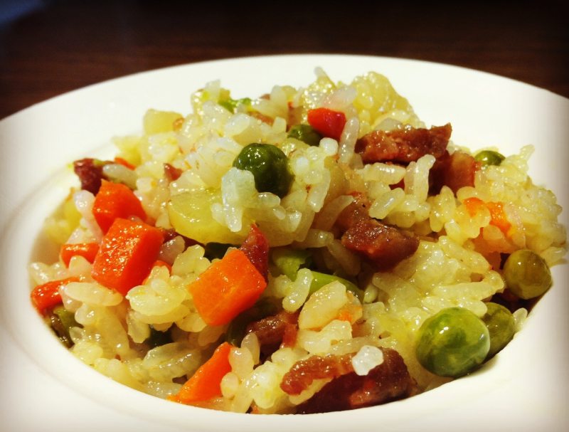 8:将炒好的香肠菜丁,和油一起拌入米饭
