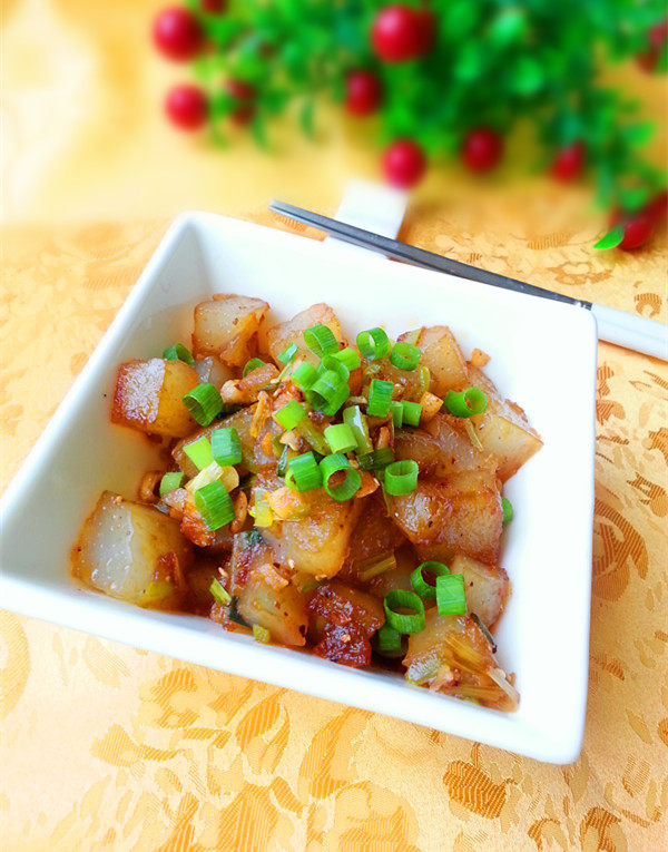 10:成品装盘,将葱切碎洒上即可食用。