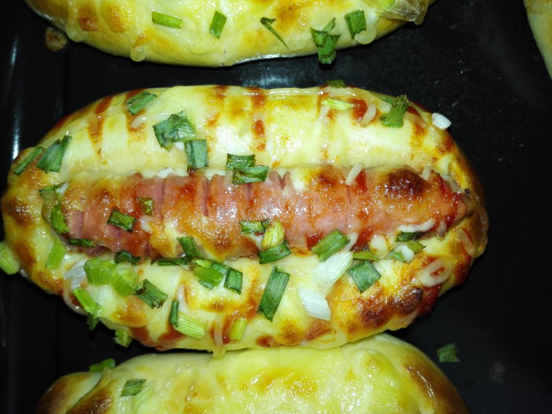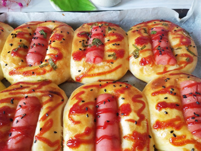 18:挤上番茄酱和沙拉酱,撒上葱花。烤箱预热十分钟后,置入肠仔包,上下火170°烤20分钟。烤的颜色达到满意的效果时,可以用锡纸遮挡表面,以免烤的颜色过黑。