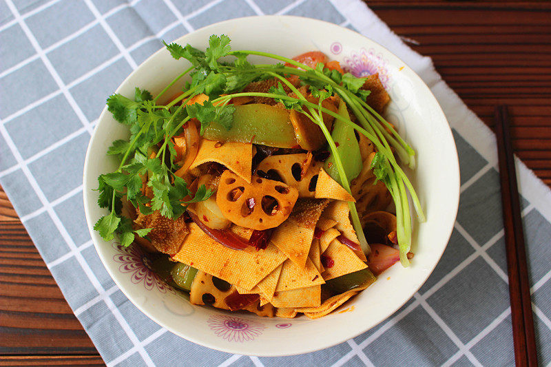 牛百叶适量;莲藕适量;莴笋适量;豆腐皮适量;洋葱适量;