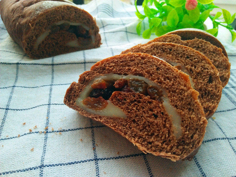 高筋粉250g;盐3g;酵母4g;黄油25g;可可粉15g;糖35g;水160~170g;