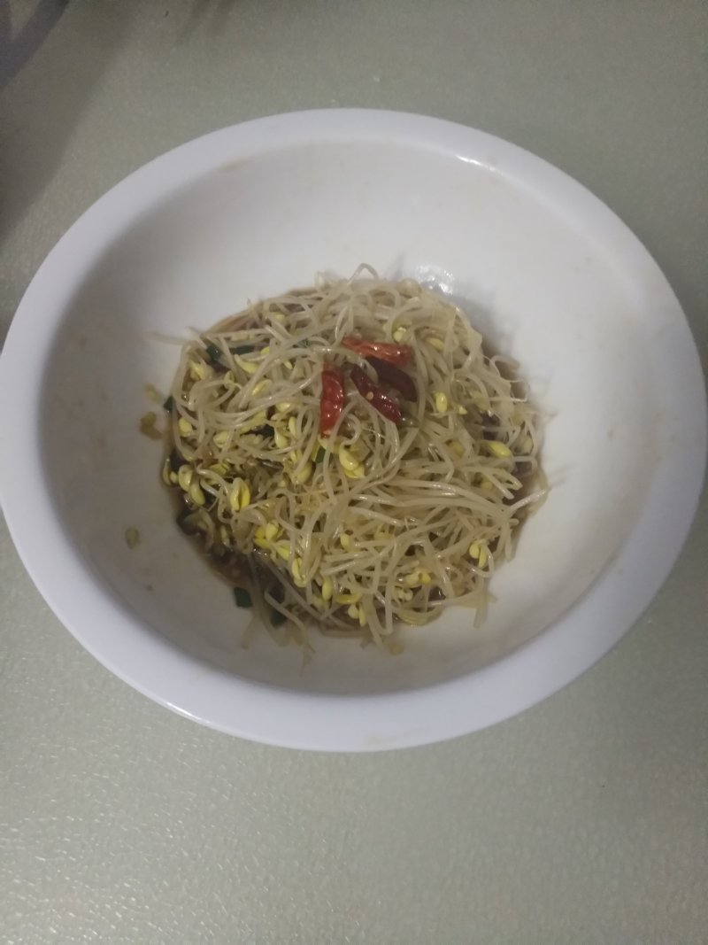 4:将葱姜蒜末,食盐和干辣椒段撒在豆芽上,淋上热油。