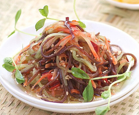 2:青笋腌十分钟,放入盆中,胡萝卜丝和木耳丝用开水焯二十秒钟,捞出过冷水,沥干后倒入青笋丝中。