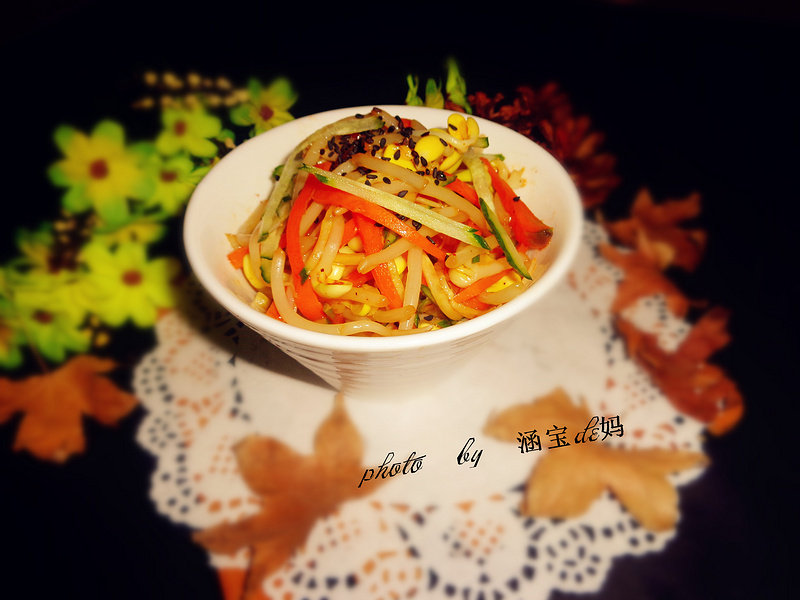 4:将黄瓜丝放入炒好水的豆芽和胡萝卜丝中