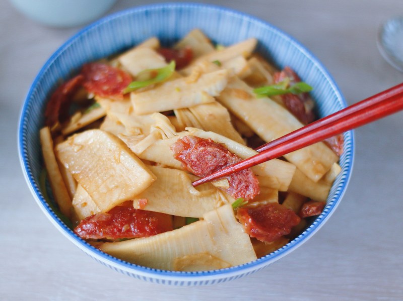 1:准备好两三个小个儿冬笋,两根腊肠或一块腊肉。切蒜末葱丝备用。