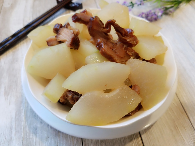 9:腊肉烧30分钟后倒入切好的小红椒、冬瓜片,冬瓜烧熟后调入鸡精、白糖即可
